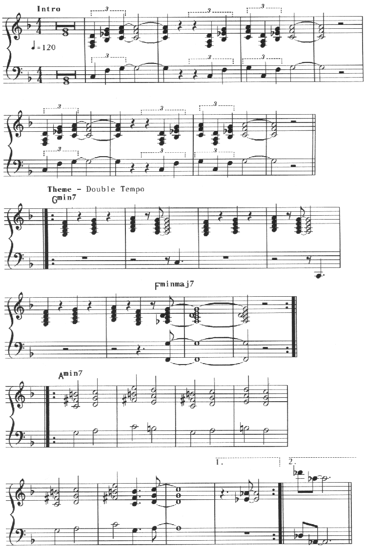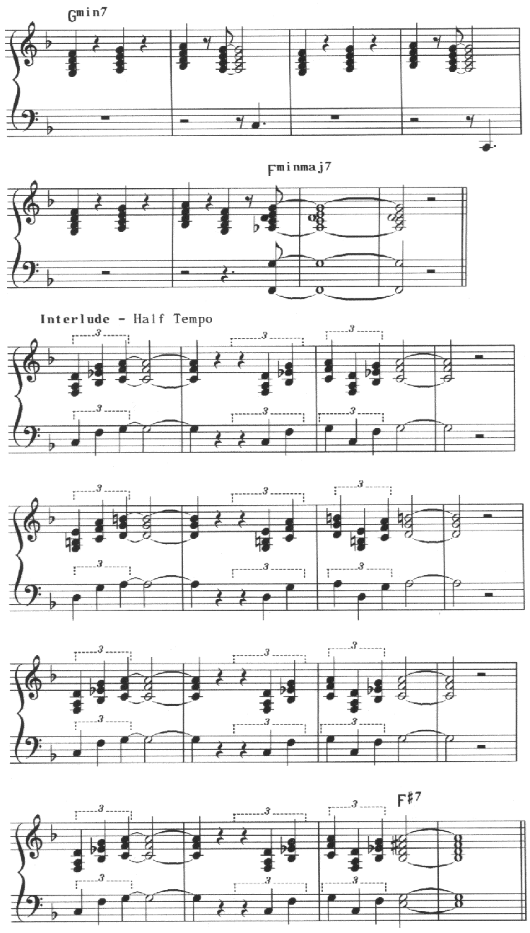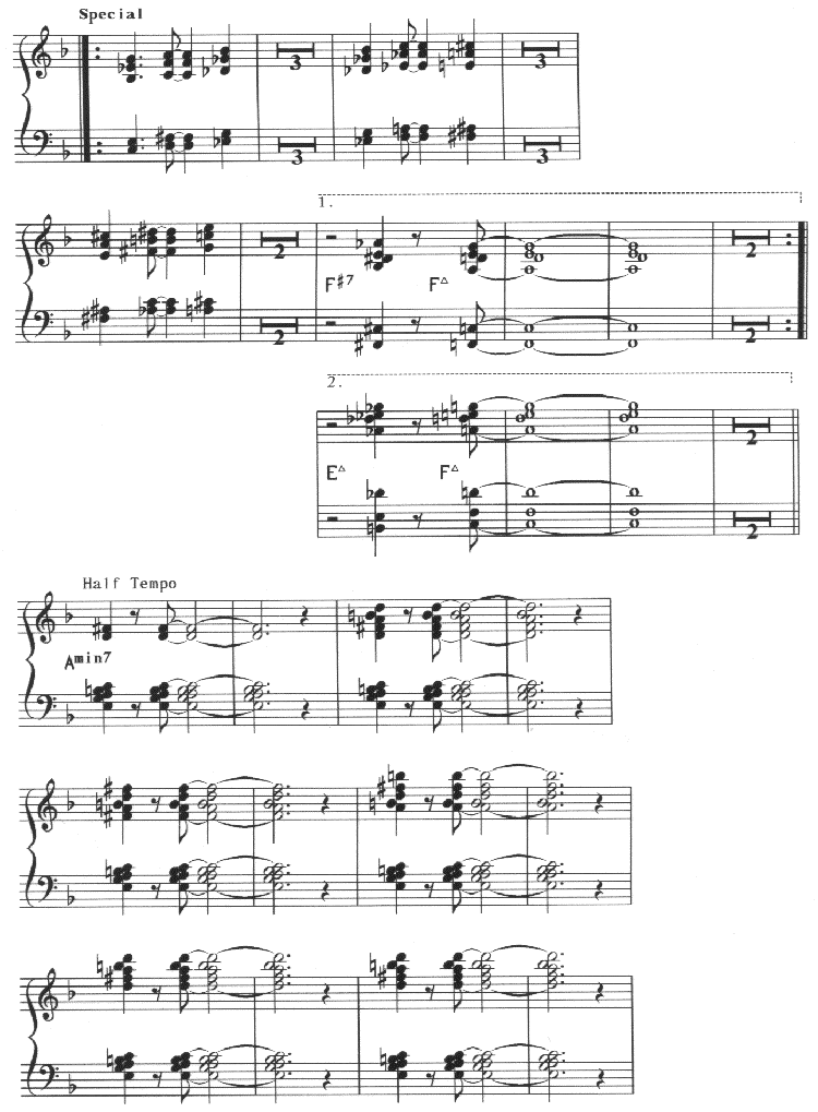 The mysterious introduction is perfect to get the audience prepared for something modal. The chords are all fourth-voicings. The bass just plays the bottom note of the voicings. The theme is very cleverly arranged with a kind of a C-pedal thing going on in the left hand of the piano which prepares you for the upcoming FminMaj7 chord (in the improvisation a Fmaj7). The melody in the bridge is voiced with fourth-voicings and the bass and drums play a shifting rhythmic pattern; listen to the record to hear what I mean! The interlude is actually the same as the introduction enhanced with a modulation and a F#7 at the end to create the feeling of wideness suited for a modal tune. The special: