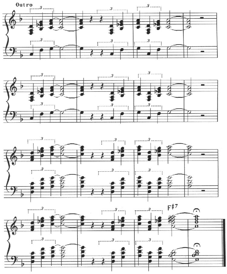 This is what I like in the Ray Brown-trio. Every special they play in different songs fit the style and mood of the song! This special is no exception: a perfect special for a modal song. Listen carefully for the dynamics they use and the tension they create with clusters and Jeff Hamiltons flawless fills. Benny Green again improvises (in octaves!) again and picks up the melody at the bridge. There are some minor varations in the end-theme, but you can listen for them yourself or just play the same as in the beginning. I did however transcribe the outtro: