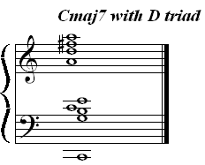 Note: the root position doesn't sound good in every inversion: trial and error. Note: 3,5,maj7,9 doesn't sound good without a bass player. Note: triad in the right hand sounds modern (lydian) (example in midi and mpeg3 (51k))